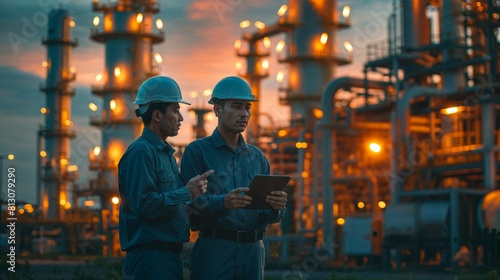 Two engineers engaged in discussion against the backdrop of an oil refinery, power plant, and the setting sun