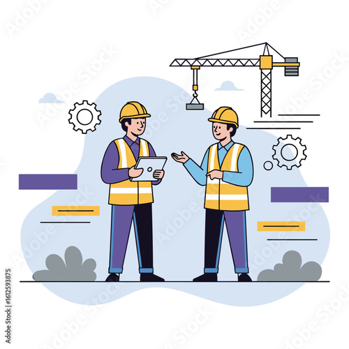 Two engineers in hard hats discussing a building project with a tablet on a construction site