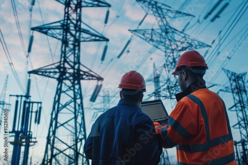 Two engineers using a laptop at a power station to plan electricity production at high voltage