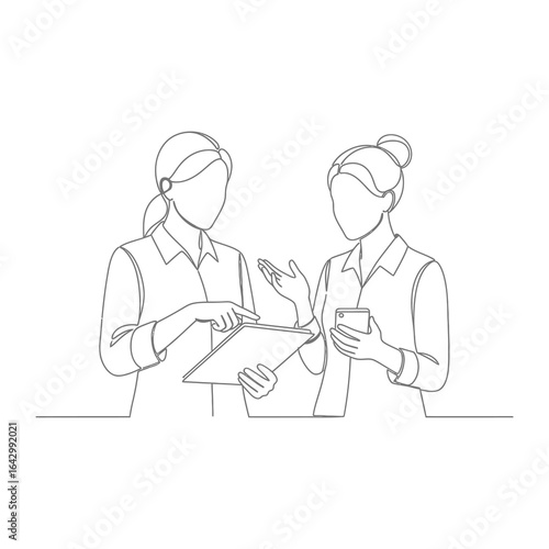 Two female business persons discussing work: Illustrative Line Art depicting Two women business colleagues engaged in discussion and planning, they are collaborative for a project.