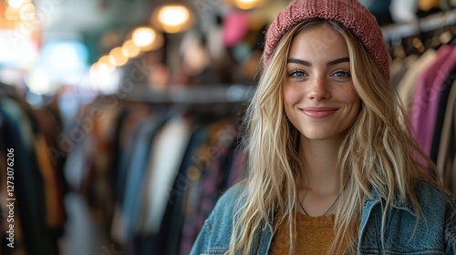 two female friends enjoying shopping together in a trendy independent clothing store browsing through fashionable racks of clothes