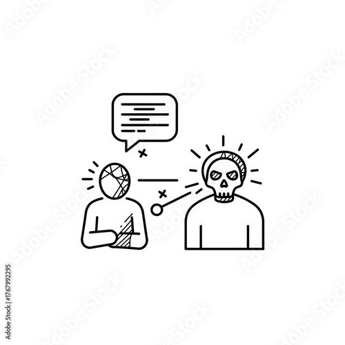Two figures one with a diamond head and the other a skull head communicating.