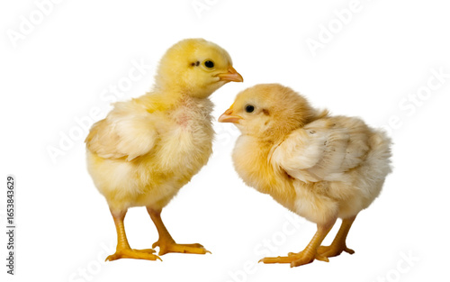 Two fluffy yellow chicks standing close together on a black background in a studio shot