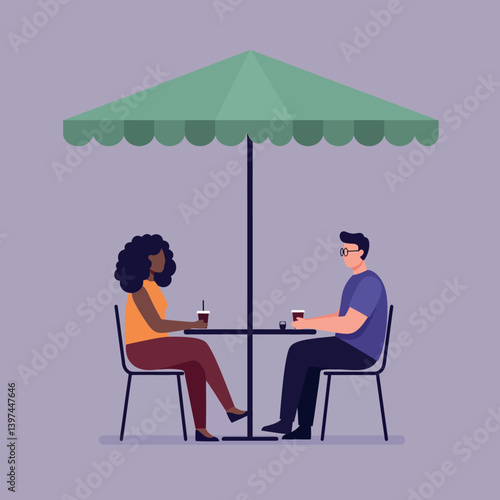 Two friends enjoying beverages under a green umbrella at an outdoor café in a flat vector illustration