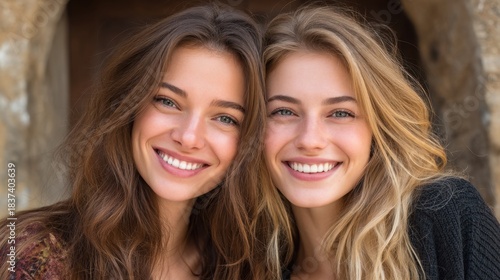 Two friends stand close to each other smiling brightly at the camera. They enjoy a sunny afternoon outdoors sharing a joyful moment in a friendly atmosphere.