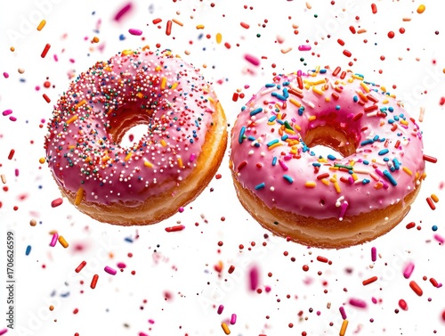 Two frosted donuts with sprinkles floating mid-air on a white background