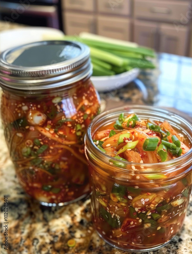 Two glass jars of homemade kimchi on a kitchen counter, sunlight streaming through the window. Concept of fermentation, traditional food, and homemade recipes