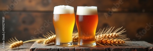 Two glasses of beer with frothy tops, surrounded by wheat, on a rustic wooden background, perfect for brewery promotions, restaurants, or craft beer marketing.