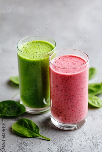 Two glasses of colorful smoothies made with fresh spinach and mixed berries, symbolizing healthy lifestyle and balanced vegan diet choice