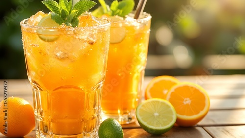 Two glasses of refreshing orange citrus drinks with ice and mint garnish, placed on a wooden table alongside fresh oranges and limes.