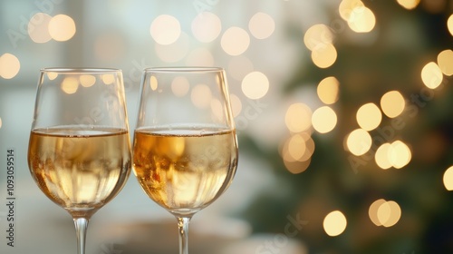 Two glasses of sparkling wine are elegantly positioned against a backdrop of warm, glowing Christmas lights, evoking a festive, celebratory atmosphere.