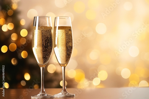 Two glasses of wine with bokeh background close up. Happy New Year, Christmas mood. Greeting card. Party and holiday celebration concept