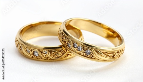 Two Gold Rings with Gemstone and Polished Finish on Reflective Surface in Elegant Jewelry Composition