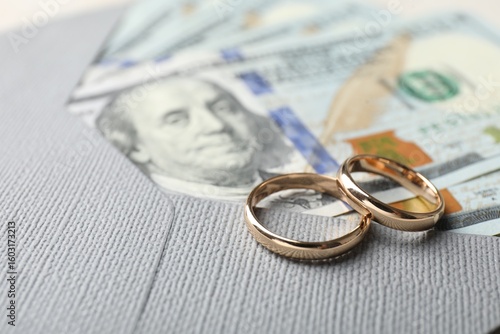 Two gold wedding rings, dollar banknotes and envelope, closeup