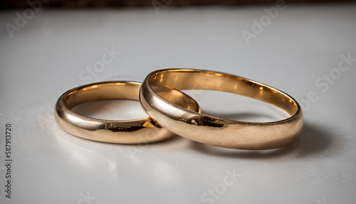 Two golden wedding rings / wedding / marriage / lying on a light neutral background. Space for text. Ideal as banner, wallpaper or background