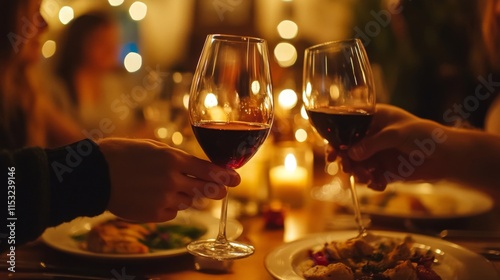 Two hands clinking wine glasses during a romantic dinner