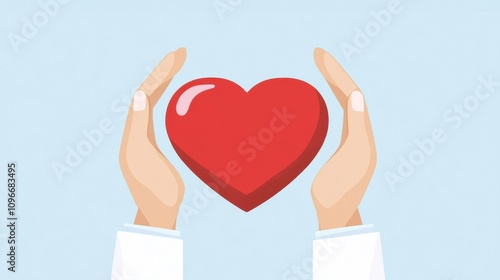 Two hands gently holding a red heart against a light blue background, symbolizing care, love, and compassion.