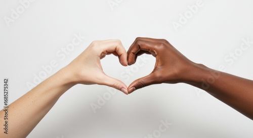 Two hands, one light and one dark, forming a heart shape against a white background.