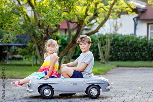 Two happy children playing with big old toy car in summer garden, outdoors. Kid boy pushing and driving car with little toddler girl, cute sister inside. Laughing and smiling kids. Lovely family