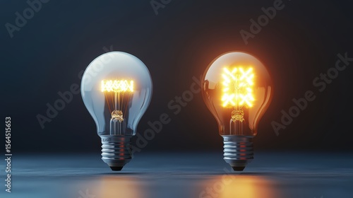 Two incandescent light bulbs glowing against a dark background, one lit with a warm orange glow and the other with a cool white light