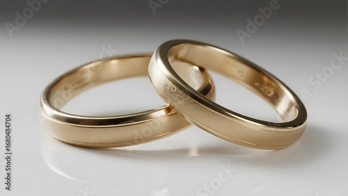 Two interlocking gold wedding rings on a reflective surface
