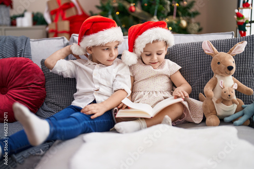 Two kids reading book sitting on sofa by christmas tree at home