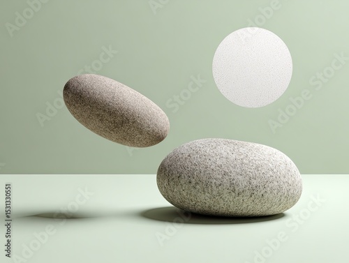 Two light brown stones, floating and resting, on a muted sage-green background, with a white circle above