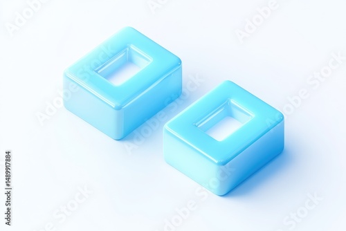 Two light-blue, glossy, rectangular blocks, each with a square cutout, sit on a white background, creating a minimalist, geometric aesthetic