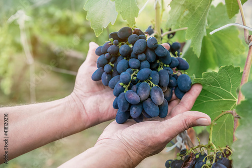 Two male hands are holding a large bunch of dark ripe grapes in the garden