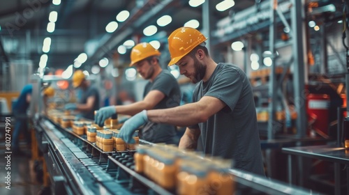 Two men in a factory are working on a conveyor belt