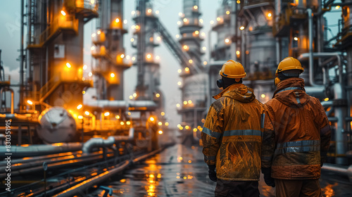 Two men in yellow helmets stand in front of a large industrial plant. The plant is lit up with bright lights, creating a sense of energy and activity