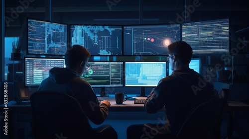 Two Men Working on Computer Screens at Night - Technology, Collaboration, and Productivity, Generative AI