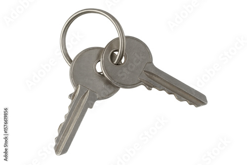 Two metal keys on a key ring are isolated on a transparent background, ready for use in various projects