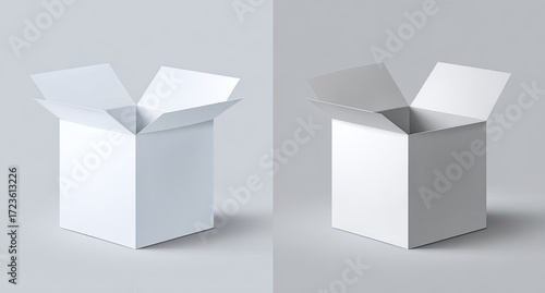 Two open boxes, one white, one gray, on a light gray background. Both are square and show interior