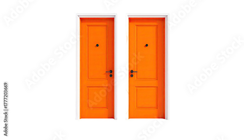 Two orange doors stand beside each other in white frames