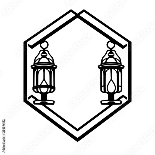 Two ornate, lantern-style lanterns hang within a hexagonal frame, black and white.