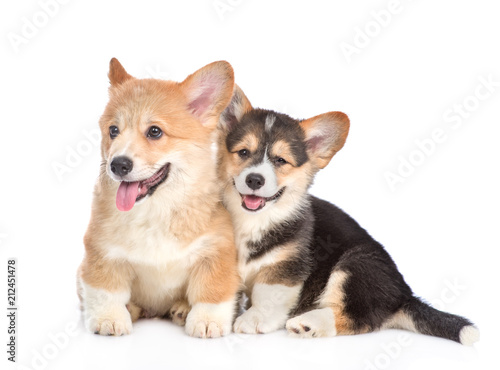 Two pembroke welsh corgi puppies together. isolated on white background