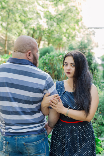 Two people in love are standing on a beautiful alley in the park.