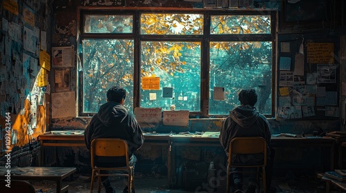 Two people sitting at desks looking out a window, surrounded by colorful notes on the wall