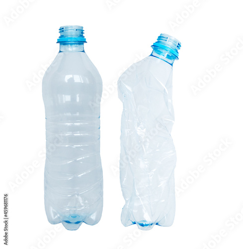 Two plastic bottles, one whole second crumpled, ecology. On white background