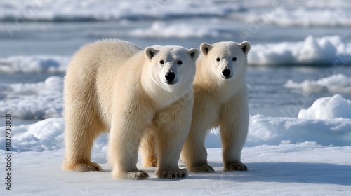 Two Polar Bears Standing on Ice in Arctic Landscape under Clear Blue Sky