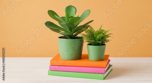 Two potted green succulent plants are placed on a stack of colorful books against a warm orange background
