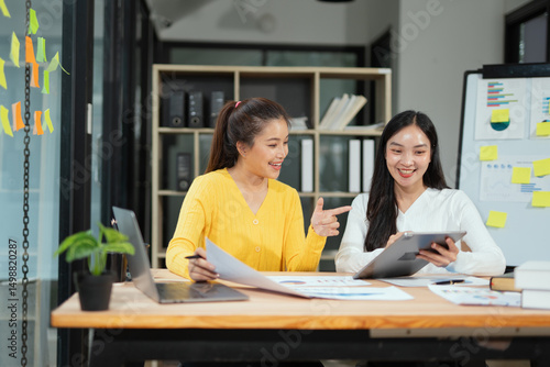 Two professional business executives working on laptop computer sitting at office desk, happy colleagues discussing company digital strategy.