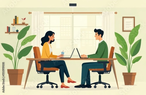 Two professionals engage in a collaborative discussion at a well-lit desk surrounded by plants. Laptops are open as they share ideas and work together in a contemporary workspace.