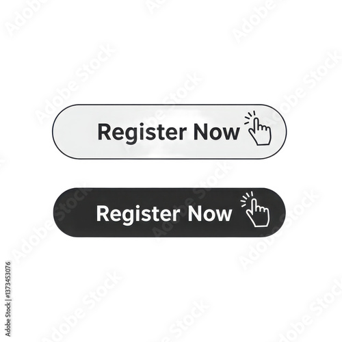 Two register now buttons in white and black with a hand cursor on a transparent background