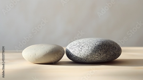 Two Round Stones On Wooden Surface In Natural Light Minimalist Still Life