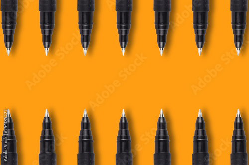 Two row of black and green plastic pens on orange background with copy space for your text. Top view