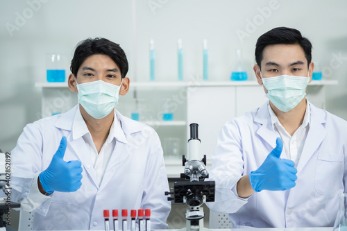 Two scientists wearing hygiene masks, glove,s and lab coats sitting and thumb up in the laboratory. Research on the coronavirus vaccine to prevent COVID-19. Medical and health concept.