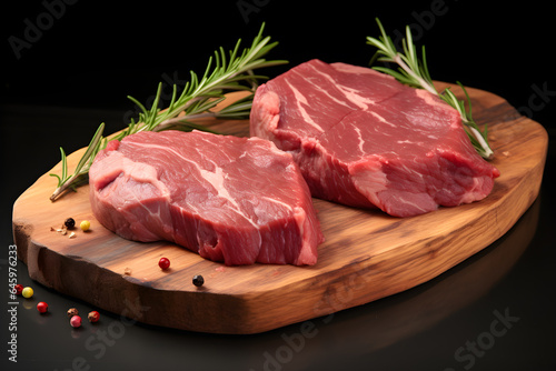 Two sections of raw beef on wooden board