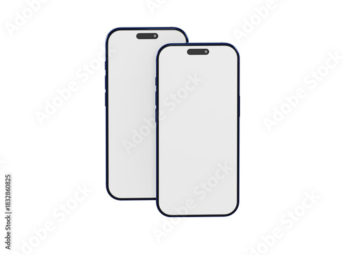 Two sleek smartphones with blank white screens ideal for mockup or app design. Perfect for tech visuals, digita